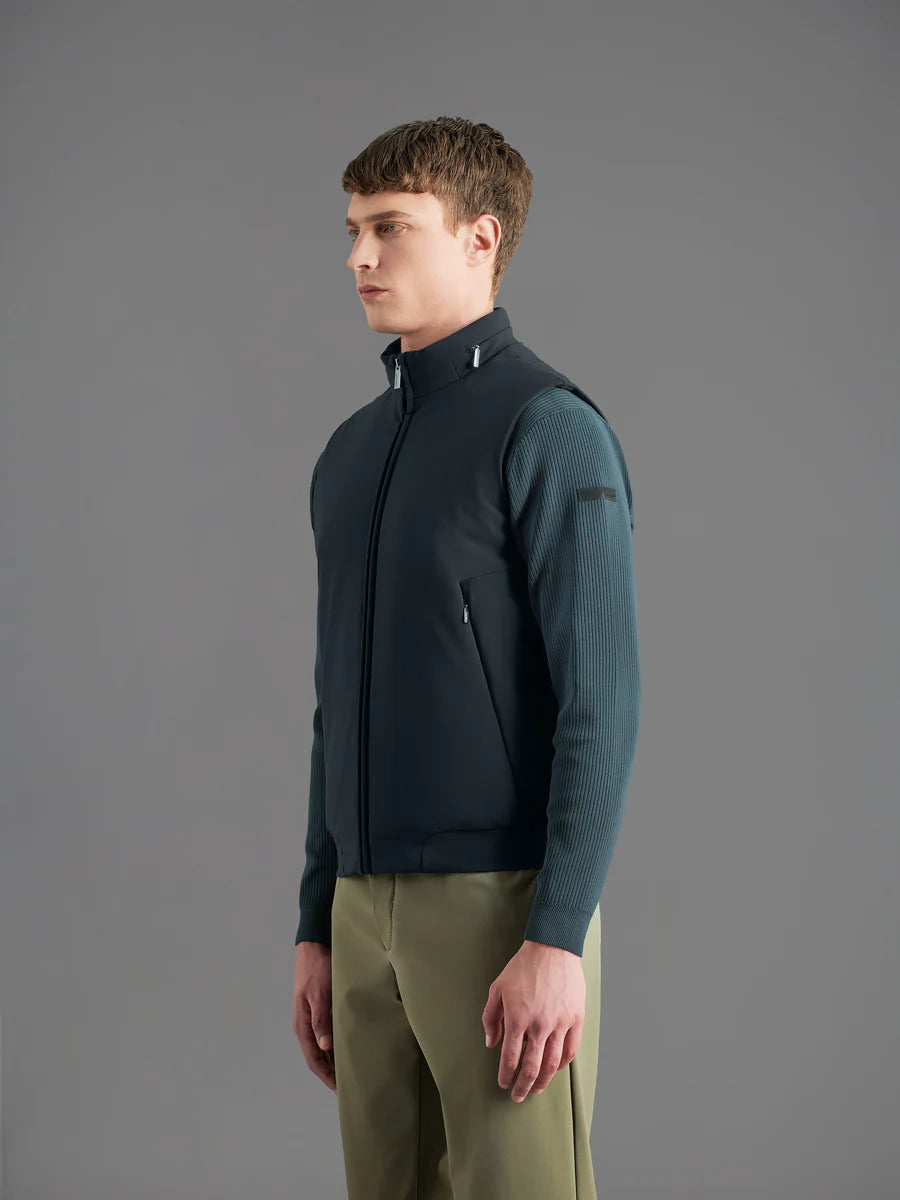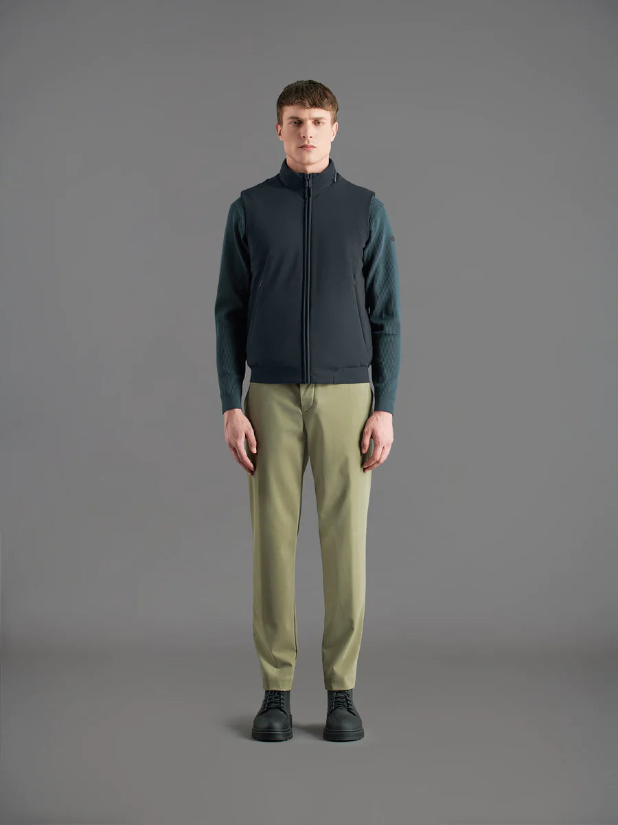 On cool days that herald the arrival of mid-season, the Revo Gilet Jkt becomes an indispensable casual resource to complement a shirt or sweatshirt. The construction in stretch and waterproof Stratofabric #2 plays on the super matte contrast of the exclusive SURFLEX® fabric and the stretch lining, which encloses the ultraslim padding. The vertical collar contains the duty hood, which protects the head when needed. The gilet features a zip closure and large side pockets with invisible zip fastening. A third internal pocket closed by a zip with double orange thread is embellished with the iconic "made with love, designed in Tuscany" heart-shaped label, which testifies to the care for design and quality even in the most hidden details.